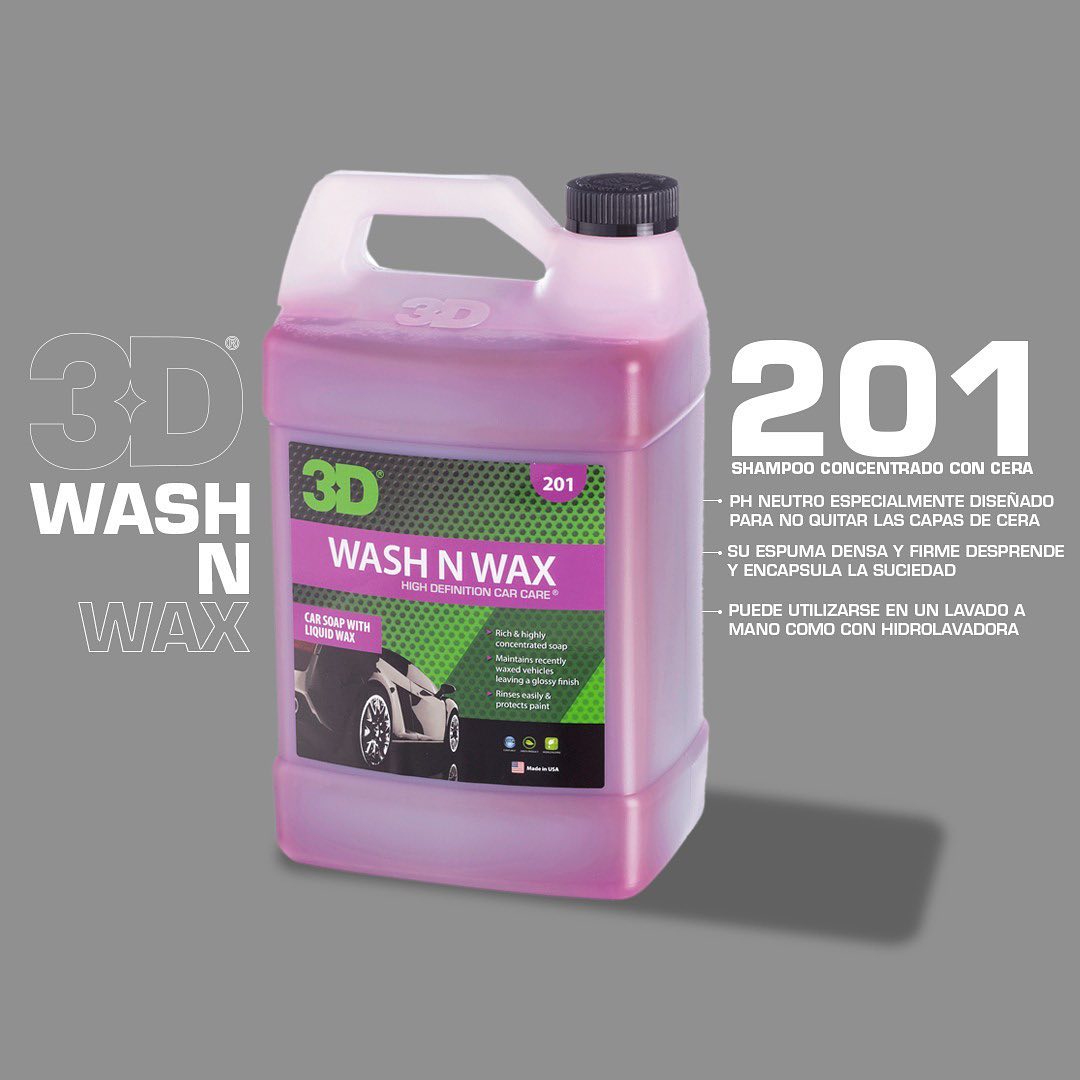 3D WASH & WAX es un shampoo altamente concentrado con cera liquida. Su espuma densa y firme desprende y encapsula la suciedad permitiendo una limpieza sin rayones, a la vez que ahorra tiempo y agua. Su fรณrmula con PH Neutro estรก especialmente diseรฑada para no quitar las capas de cera ya existente a la vez que aรฑade una nueva, dejando su vehรญculo limpio y brillante lavado tras lavado. Funciona tanto al utilizarse en un Lavado a Mano como con hidrolavadora, obteniendo un mejor resultado con esta รบltima al utilizar un FOAM KIT (T-20).