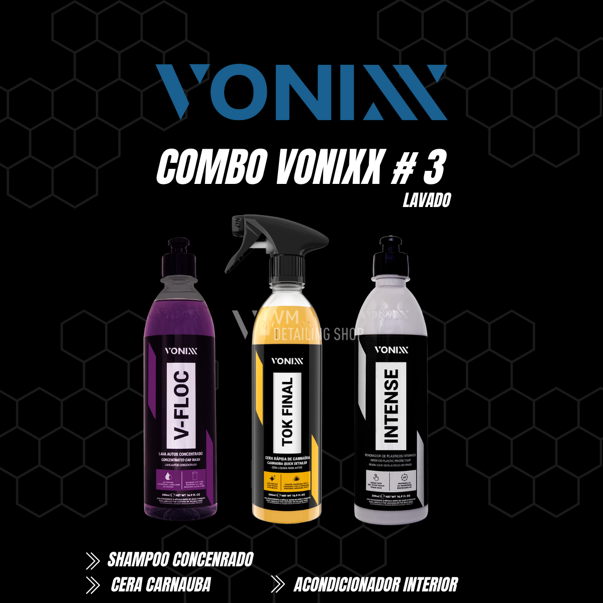 Kit de lavado Vonixx con V-Floc (shampoo), Tok Final (cera de mantenimiento) e Intense (renovador de plรกsticos) es un set de detallado para autos que cubre lavado, protecciรณn y acabado, ideal para mantener el vehรญculo limpio, brillante y protegido con productos de alto rendimiento para un acabado natural y duradero.