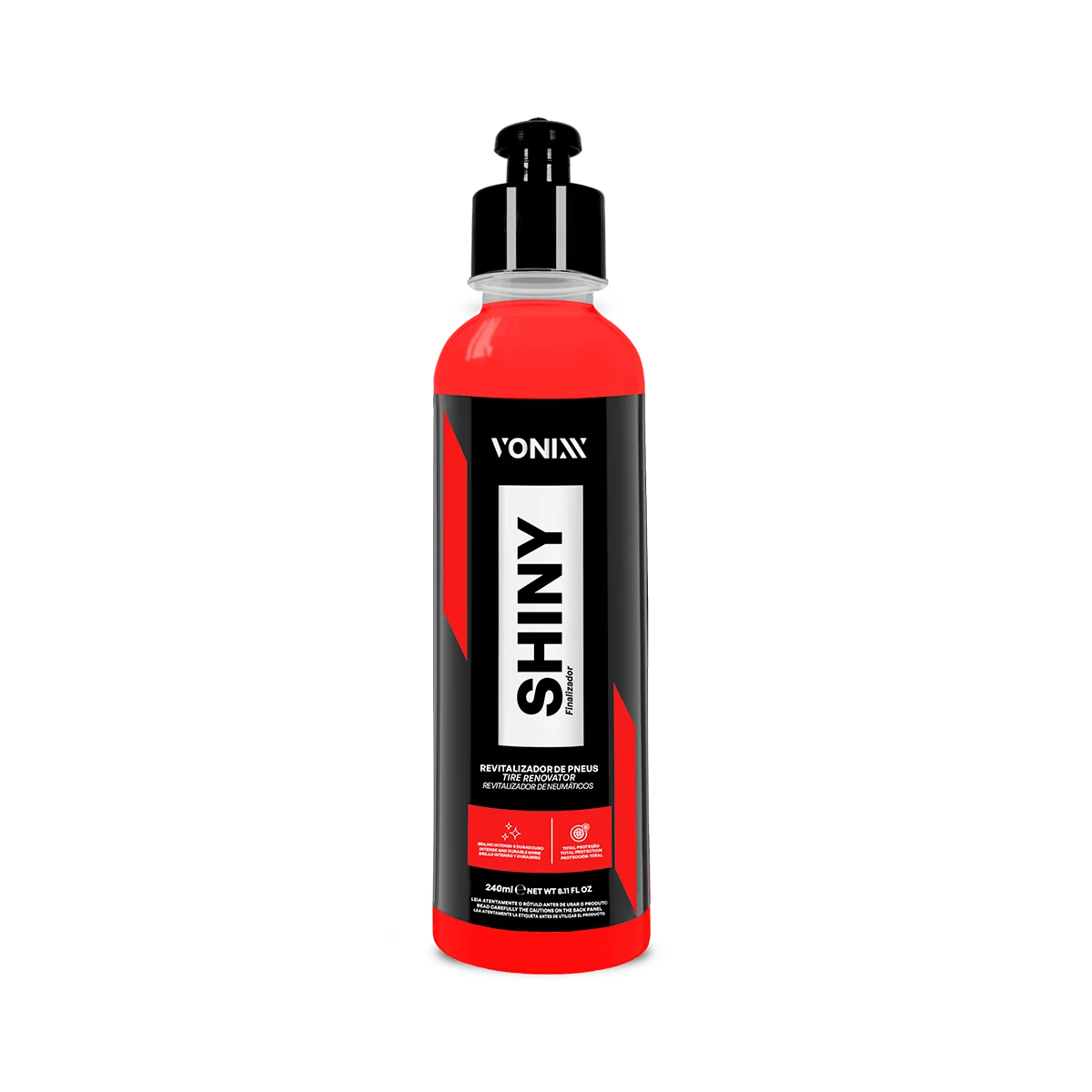 Desarrollada exclusivamente por Vonixx, su fรณrmula รบnica protege y revitaliza el caucho de los neumรกticos, manteniendo su brillo por mรกs tiempo.