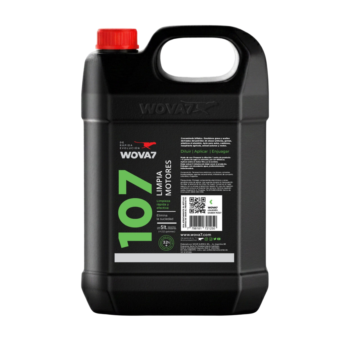 - Preparar 1 parte de LIMPIA MOTORES 107 en 6 de agua o en solvente, ya que es bifรกsico. - Cubrir las partes electrรณnicas y delicadas del motor para que no se humedezcan y rociar la disoluciรณn tratando de que penetre en los lugares donde habitualmente se produce la mayor acumulaciรณn de productos grasos.