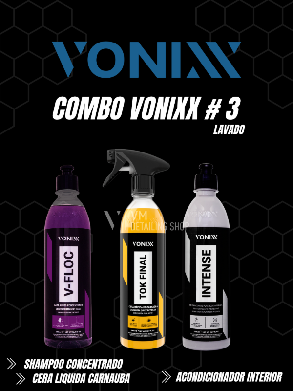 Kit de lavado Vonixx con V-Floc (shampoo), Tok Final (cera de mantenimiento) e Intense (renovador de plásticos) es un set de detallado para autos que cubre lavado, protección y acabado, ideal para mantener el vehículo limpio, brillante y protegido con productos de alto rendimiento para un acabado natural y duradero.