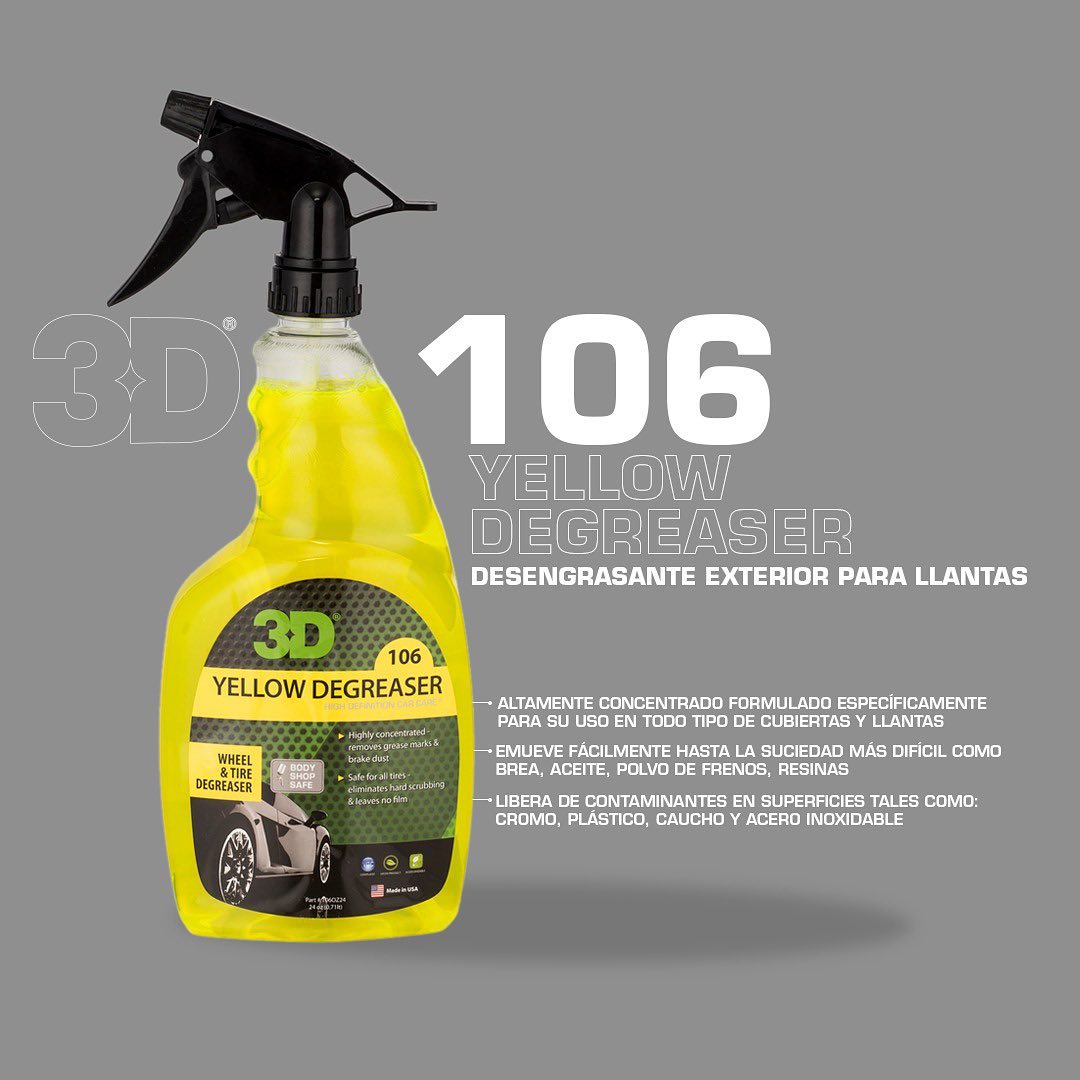 3D YELLOW DEGREASER es un desengrasante altamente concentrado formulado especรญficamente para su uso en todo tipo de cubiertas y llantas.