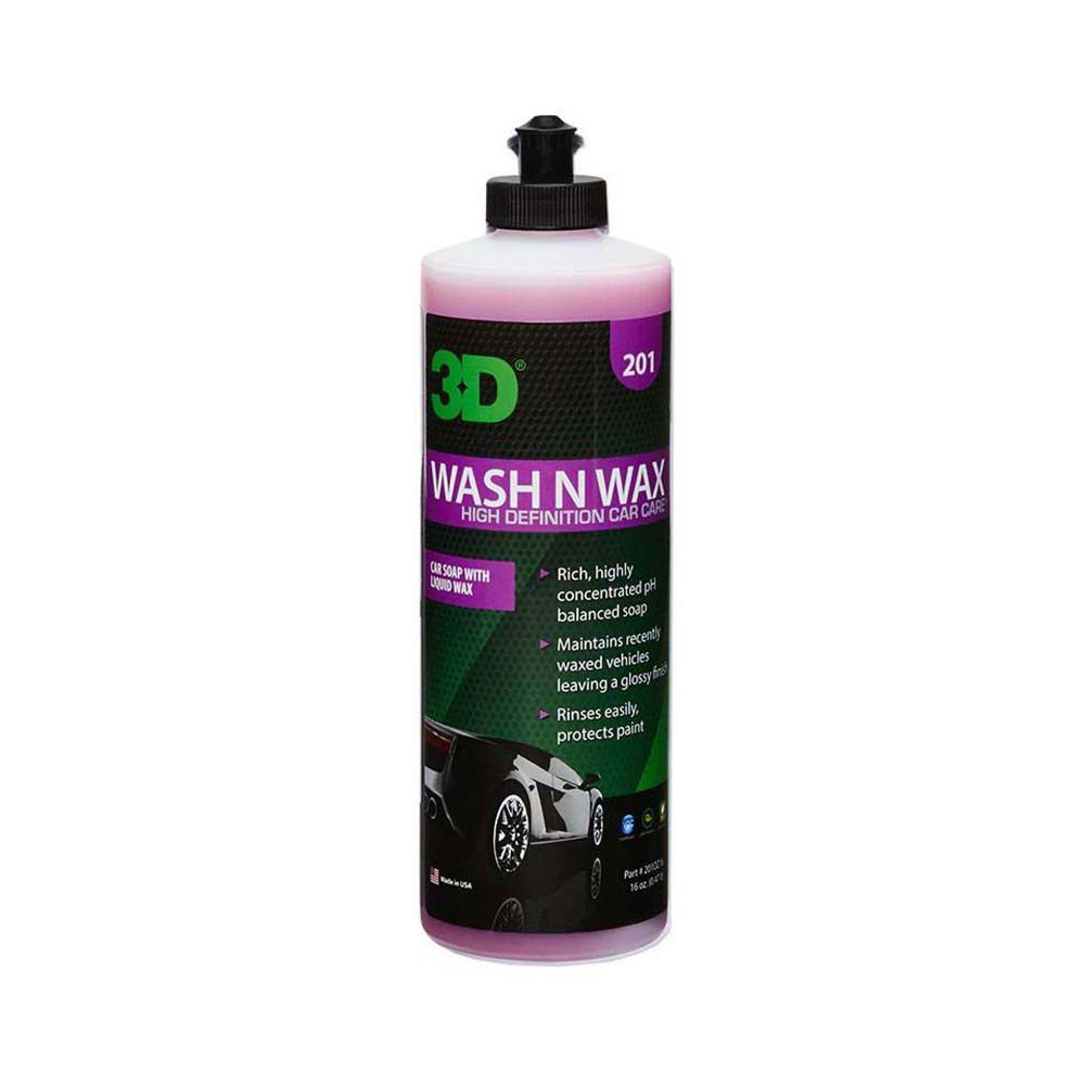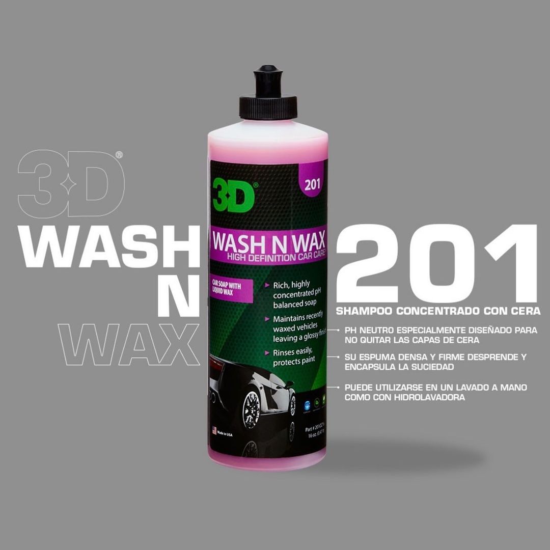 3D WASH & WAX es un shampoo altamente concentrado con cera liquida. Su espuma densa y firme desprende y encapsula la suciedad permitiendo una limpieza sin rayones, a la vez que ahorra tiempo y agua. Su fรณrmula con PH Neutro estรก especialmente diseรฑada para no quitar las capas de cera ya existente a la vez que aรฑade una nueva, dejando su vehรญculo limpio y brillante lavado tras lavado. Funciona tanto al utilizarse en un Lavado a Mano como con hidrolavadora, obteniendo un mejor resultado con esta รบltima al utilizar un FOAM KIT (T-20).