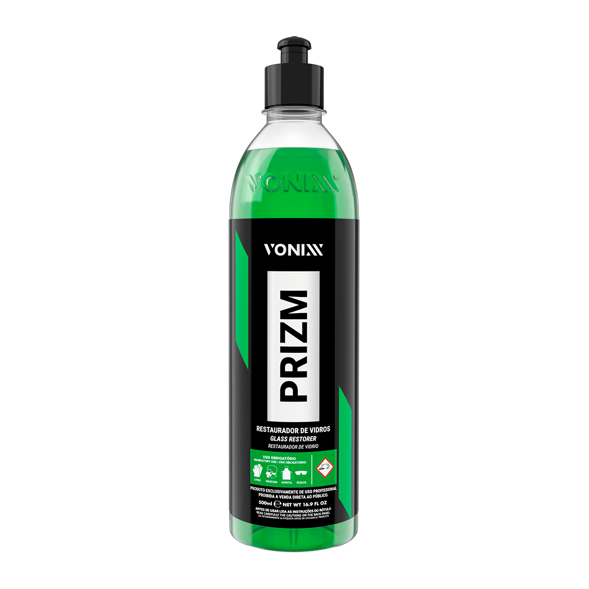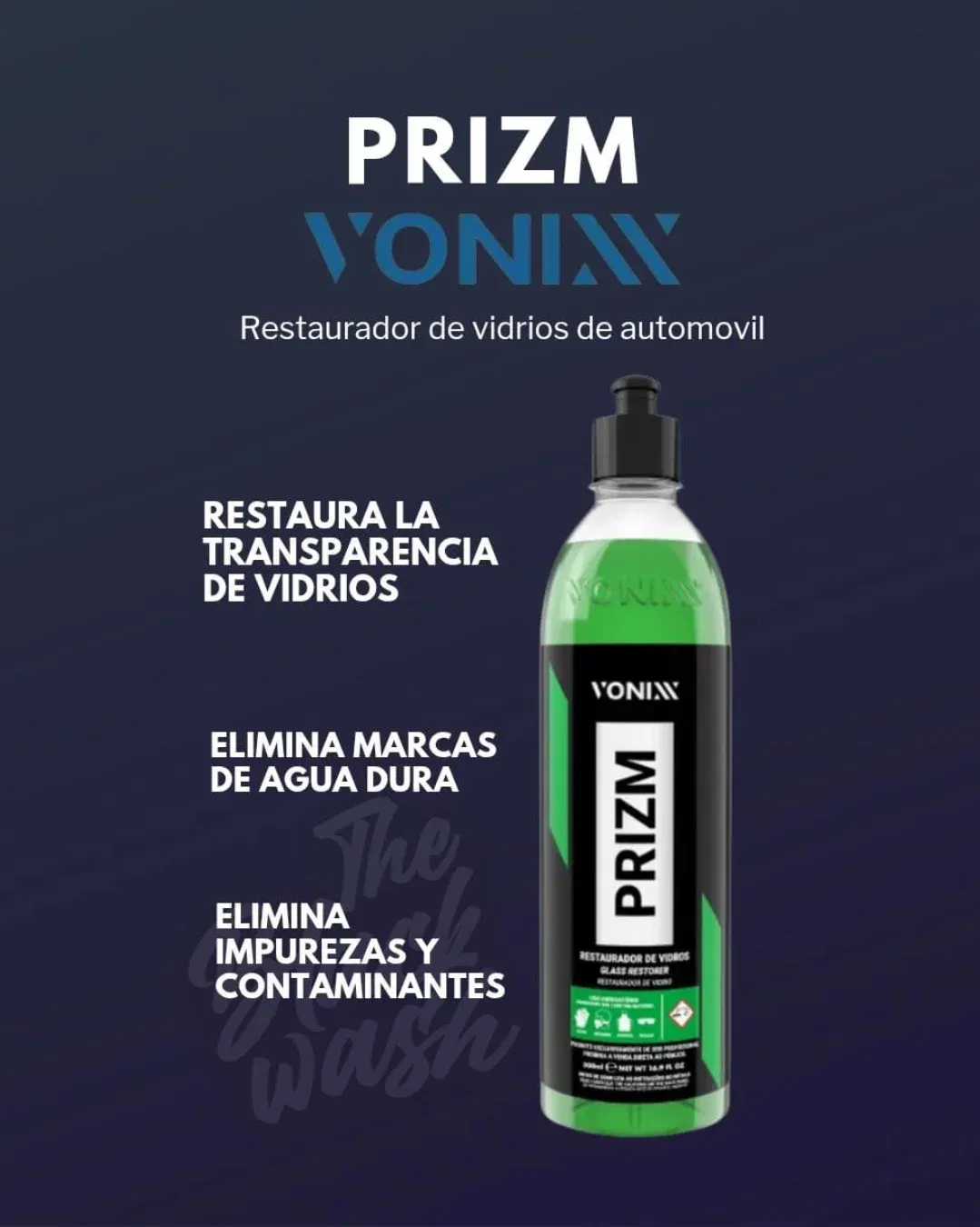 Prizm restaura la transparencia del vidrio del automรณvil y elimina las marcas de agua incrustadas las impurezas y los contaminantes que no se eliminan con la limpieza convencional.