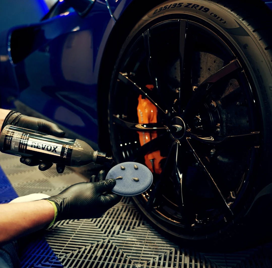 Limpiar a fondo los neumรกticos; Con la ayuda de un aplicador o espuma aplicador para neumรกticos especรญficos, aplicar el producto uniformemente, asegurando una cobertura completa, sin defectos Tenga en cuenta el nivel de brillo. Si quieres un resultado mรกs brillante, repetir la aplicaciรณn despuรฉs de 5 minutos Nota: El nivel de brillo se puede ajustar tambiรฉn de acuerdo con la cantidad de producto aplicado: la mรกs brillante producto. Si decide terminar con menos brillo aplican reducida cantidad de Revox.