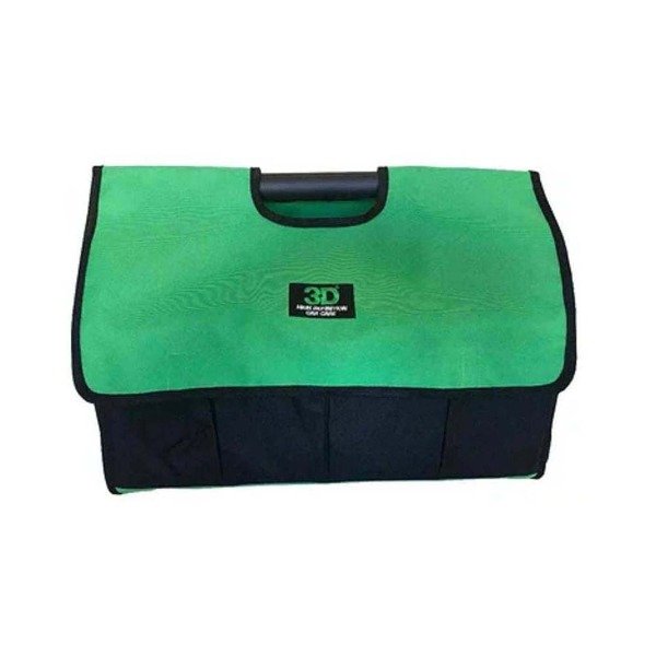 Bolso multiuso negro y verde con compartimentos para herramientas, productos, máquinas.